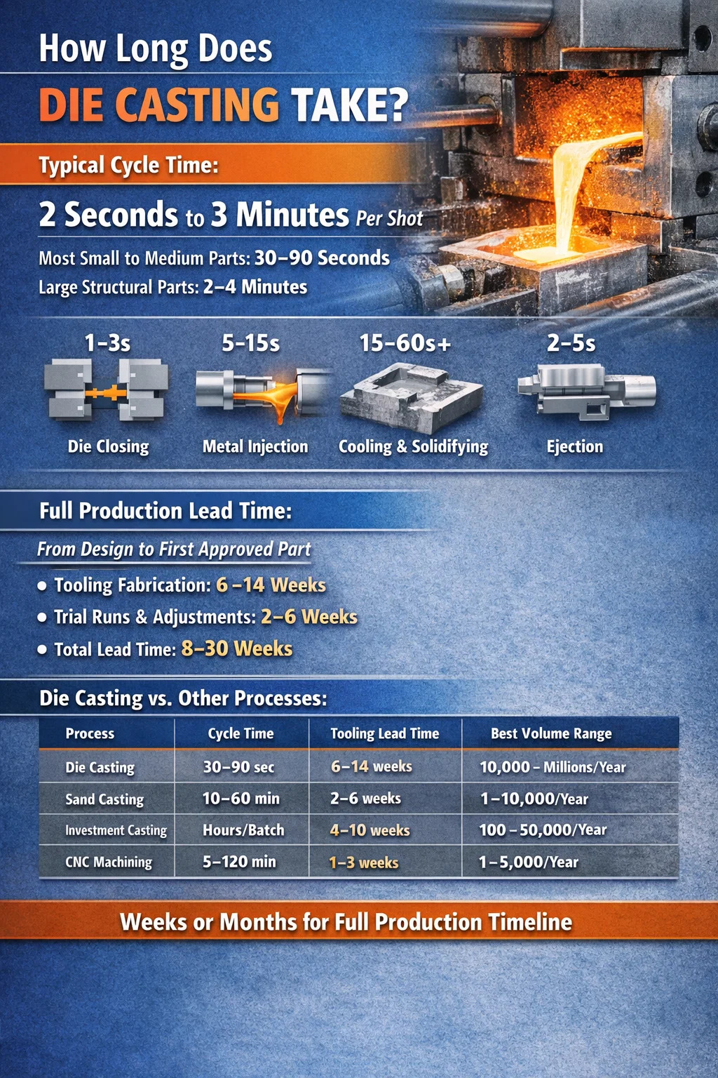 Un singolo ciclo di pressofusione in genere richiede ovunque Da 2 secondi a 3 minuti , a seconda delle dimensioni del pezzo, del tipo di lega, dello spessore della parete e della configurazione della macchina. Per la maggior parte dei componenti di piccole e medie dimensioni in alluminio o zinco, del tipo utilizzato nelle staffe, negli alloggiamenti e nell'elettronica di consumo di automobili, un tempo di ciclo realistico è compreso tra 30 e 90 secondi . Grandi parti strutturali in magnesio o alluminio per veicoli elettrici possono spingere quella finestra a 2-4 minuti per scatto.