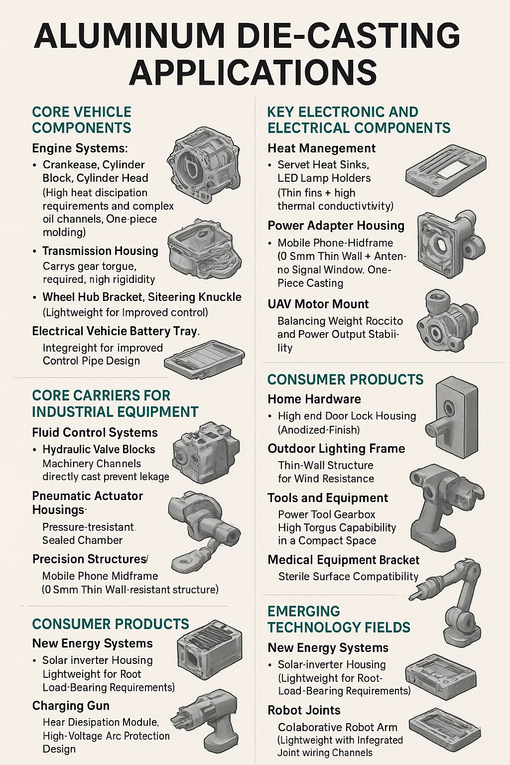 | Tecnica emergente | • Alloggi per inverter solari • Armelli articolari robotici • Letti di imaging medico • Gear di atterraggio dei droni |      ▪️                     Critico di forza a peso per la mobilità          ▪️ Integrazione del canale di raffreddamento personalizzato  |