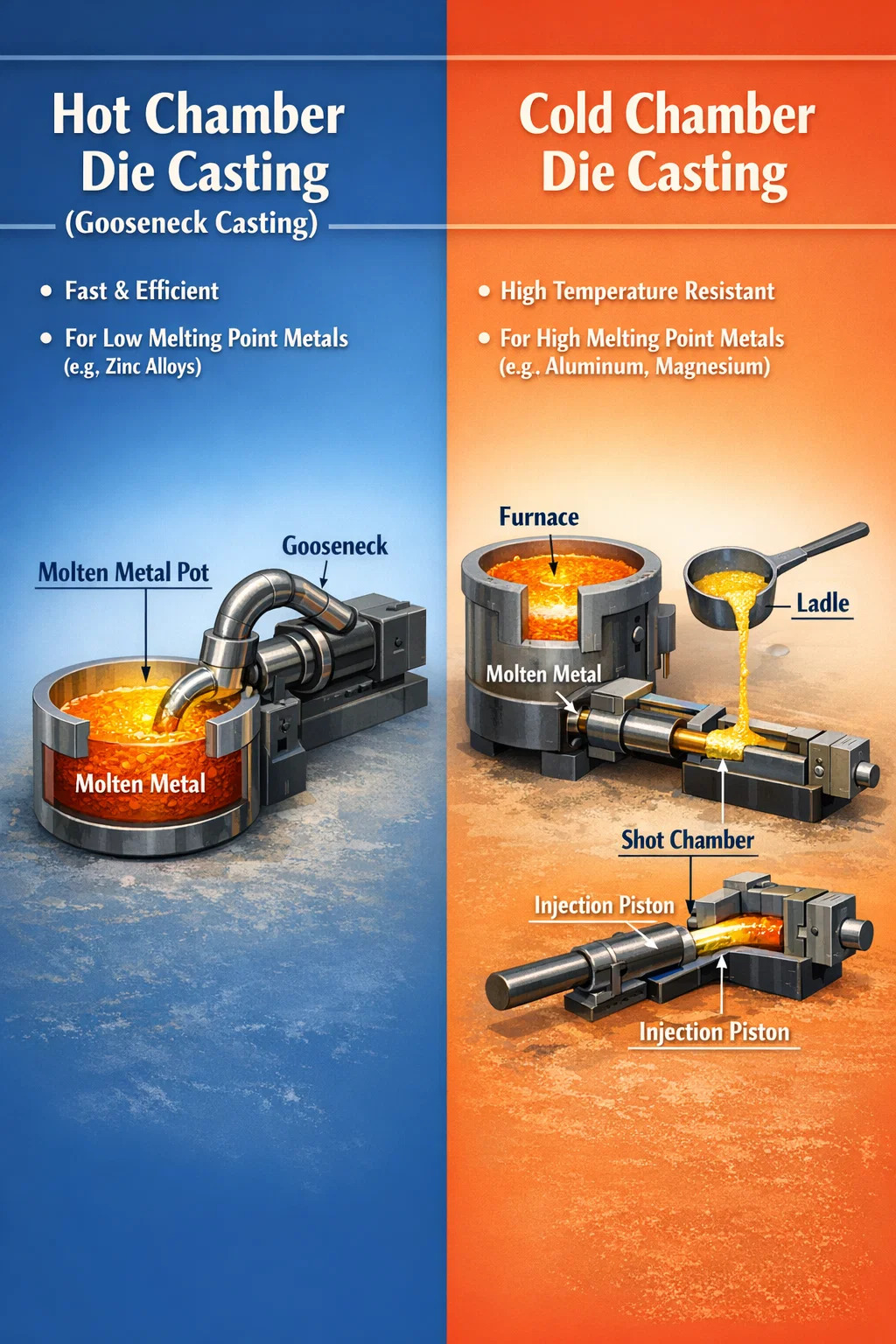 Nel mondo di pressofusione , si distinguono due categorie principali in base alla modalità di fusione e iniezione del metallo nello stampo: pressofusione a camera calda e pressofusione a camera fredda.