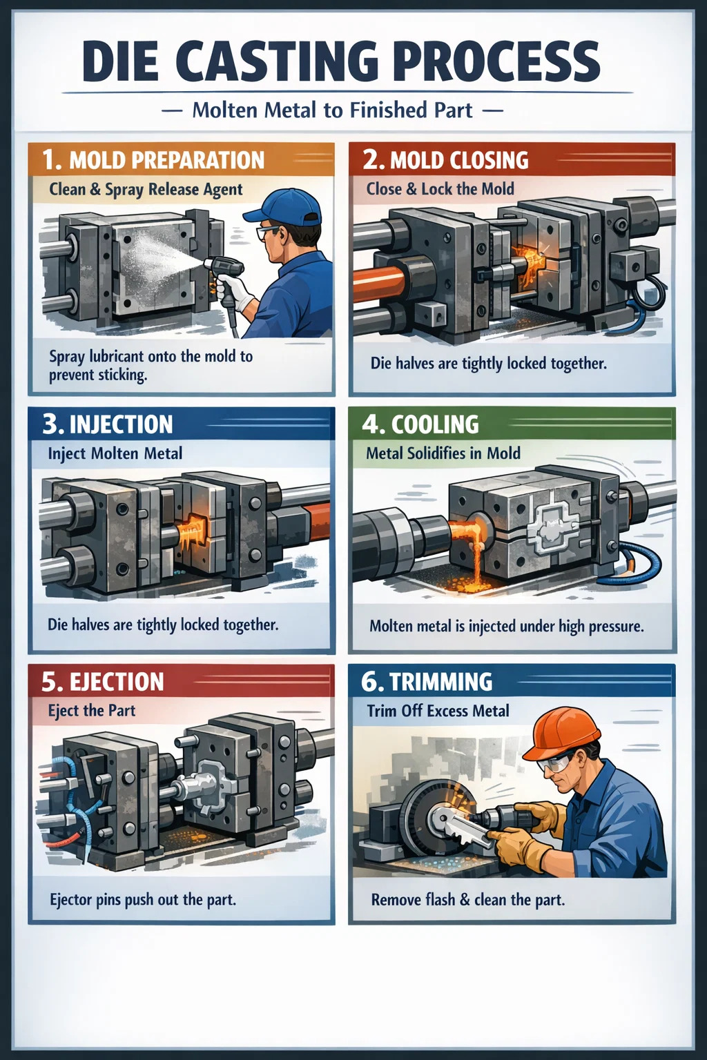 Pressofusione è come realizzare "cubetti di ghiaccio metallici" o "stampaggio a iniezione di fascia alta". È un processo in cui il metallo fuso viene "forzato" ad alta pressione in uno stampo di precisione, quindi raffreddato per formare parti solide.