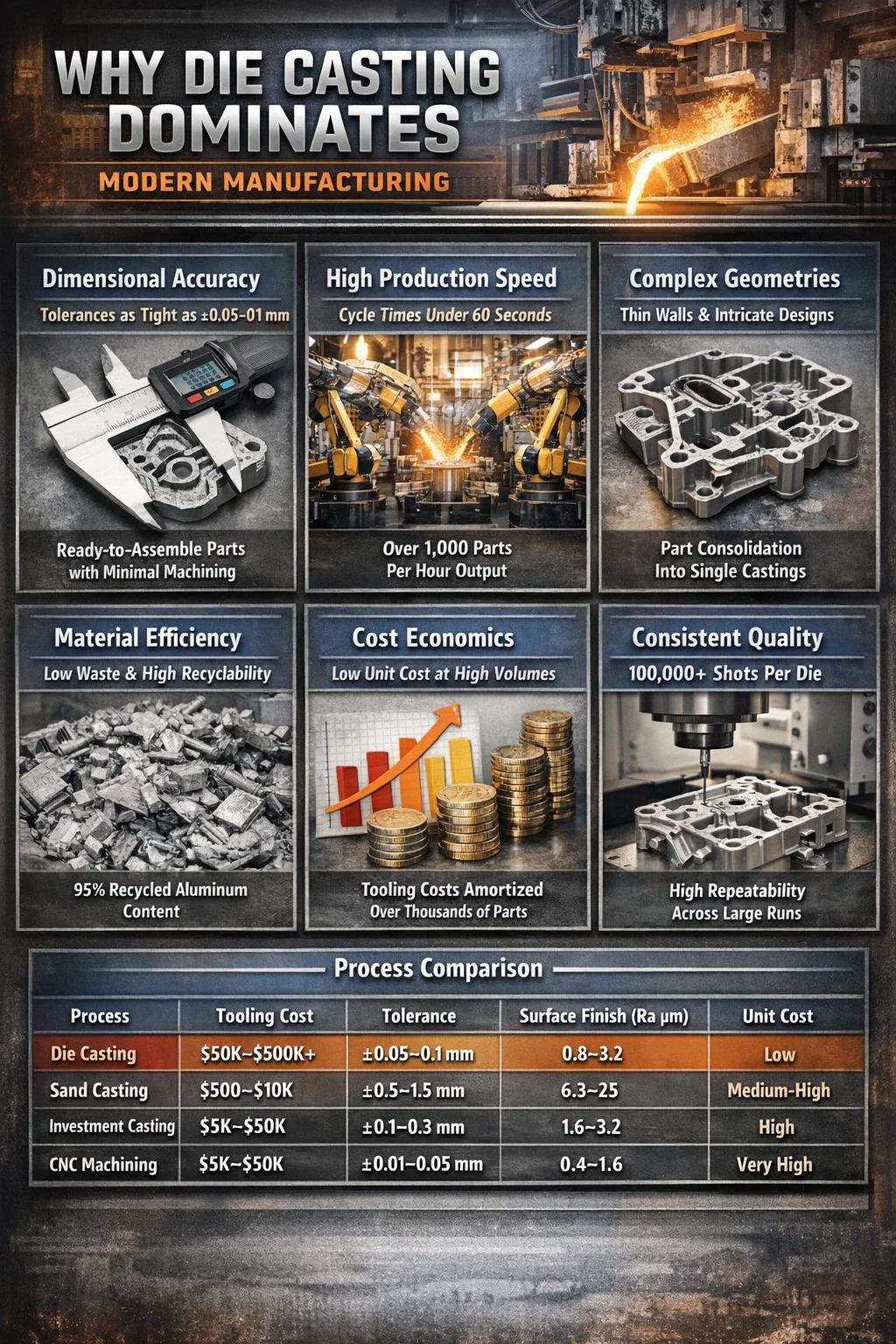 Questo articolo spiega esattamente perché la pressofusione detiene la sua posizione dominante nella produzione moderna, coprendo l'accuratezza dimensionale, la velocità, l'efficienza dei materiali, l'economia dei costi e il confronto con i processi concorrenti.